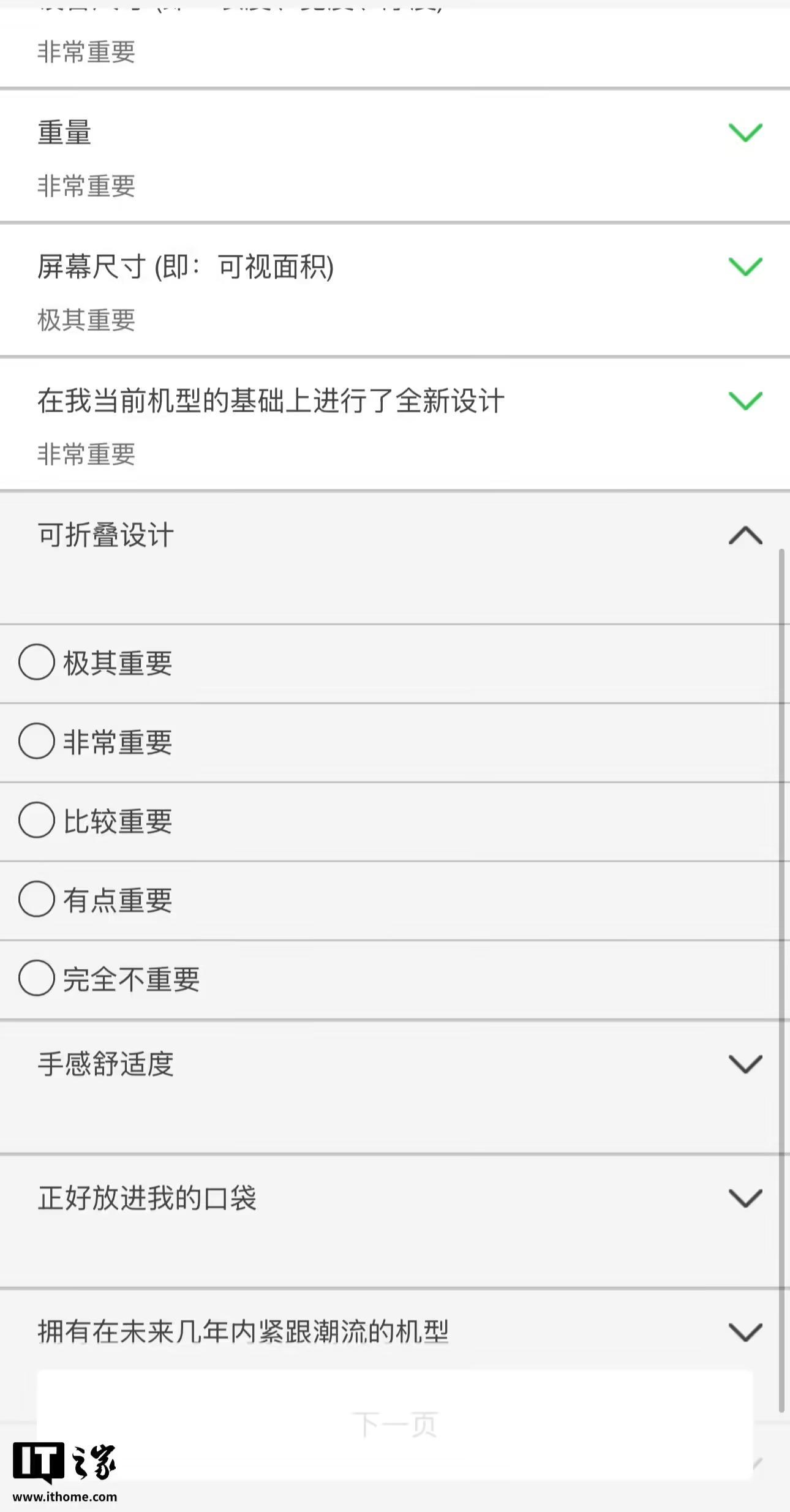 苹果于“在我当前机型的基础上进行了重新设计”问题中设下了“可折叠设计”的调研项,同时还调研了手感舒适度、潮流外形、能否放进口袋中等要素。