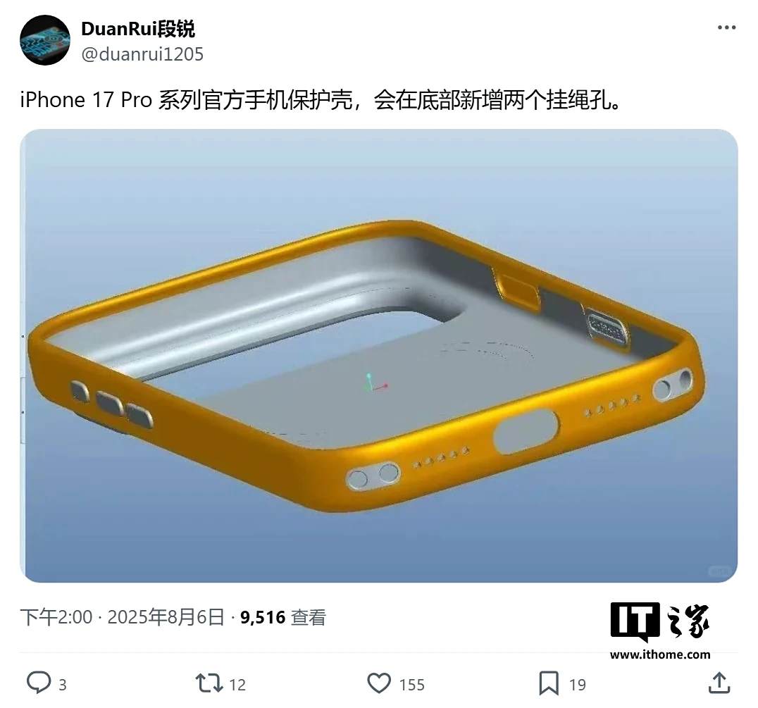 首先,@duanrui1205 昨日(8 月 6 日)在 X 平台发布推文,表示:“iPhone 17 Pro 系列官方手机保护壳,会在底部新增两个挂绳孔”。