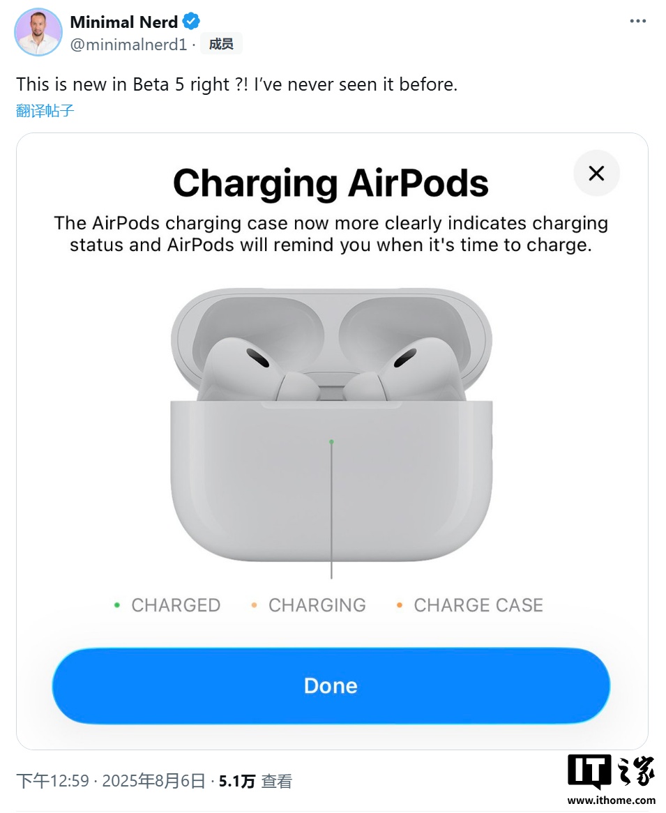 文章来源于互联网:IT之家-苹果 iOS 26 细分 AirPods 充电盒指示灯,3 种颜色升级电池通知
