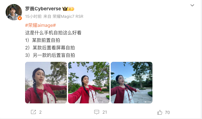 刚好,从昨天晚上到今天上午,荣耀首席影像工程师罗巍 Cyberverse 在微博上发布了多组人像自拍对比照片,并表示它们分别来自某款前置自拍、某款后置看屏幕自拍、另一款的后置盲自拍,这里面出现后置看屏幕自拍,显然就是折叠屏手机了,联系上面的爆料消息,相信这是为 Magic V Flip2 的影像能力在预热,正好也和上面的爆料信息对上了。