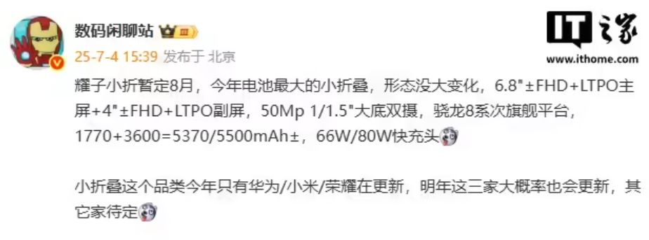 此前博主 @数码闲聊站 就曾透露,荣耀 Magic V Flip2 预计将是今年电池最大的小折叠手机,配备 6.8 英寸 ±FHD+LTPO 主屏、4 英寸 ±FHD+LTPO 副屏,50Mp 1/1.5″ 大底双摄,骁龙 8 系次旗舰平台,5370/5500mAh± 电池,66W / 80W 快充头。