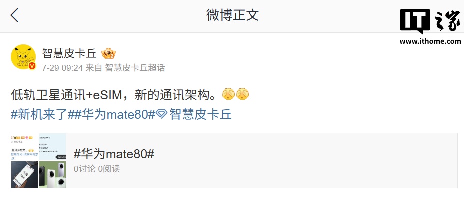 综合IT之家此前报道,博主 @智慧皮卡丘 今年 7 月在微博透露,华为新机将采用全新通讯架构,结合后续评论内容预计为 Mate 80 系列。