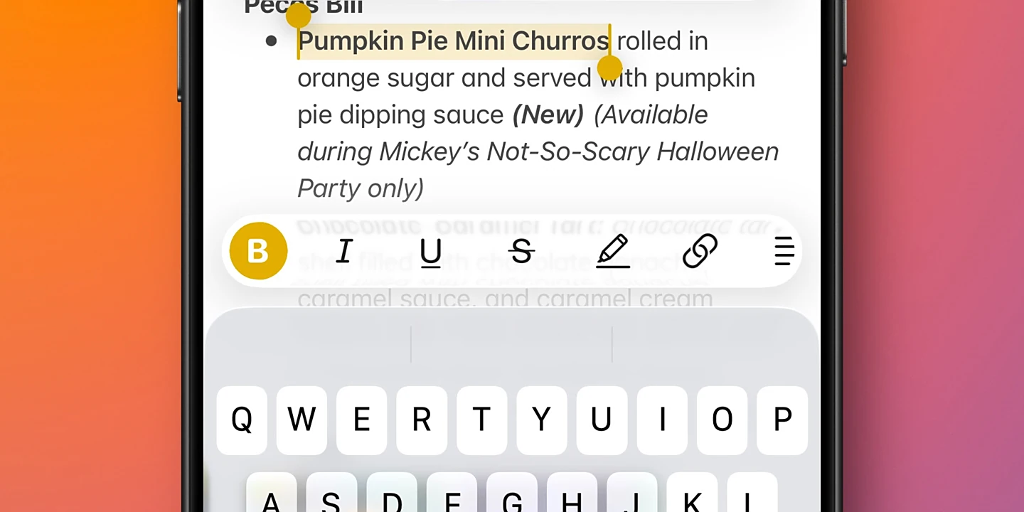 有 18 个工具确实很多,这就需要“自适应”功能来发挥作用,用户在备忘录中编写或编辑文本时,工具栏将自动显示最相关的工具。例如用户在编辑常规文本时候,备忘录会显示加粗、斜体、下划线和高亮等选项。