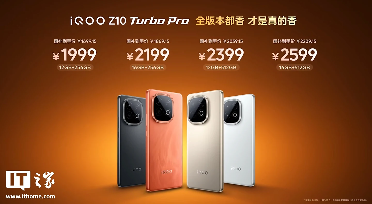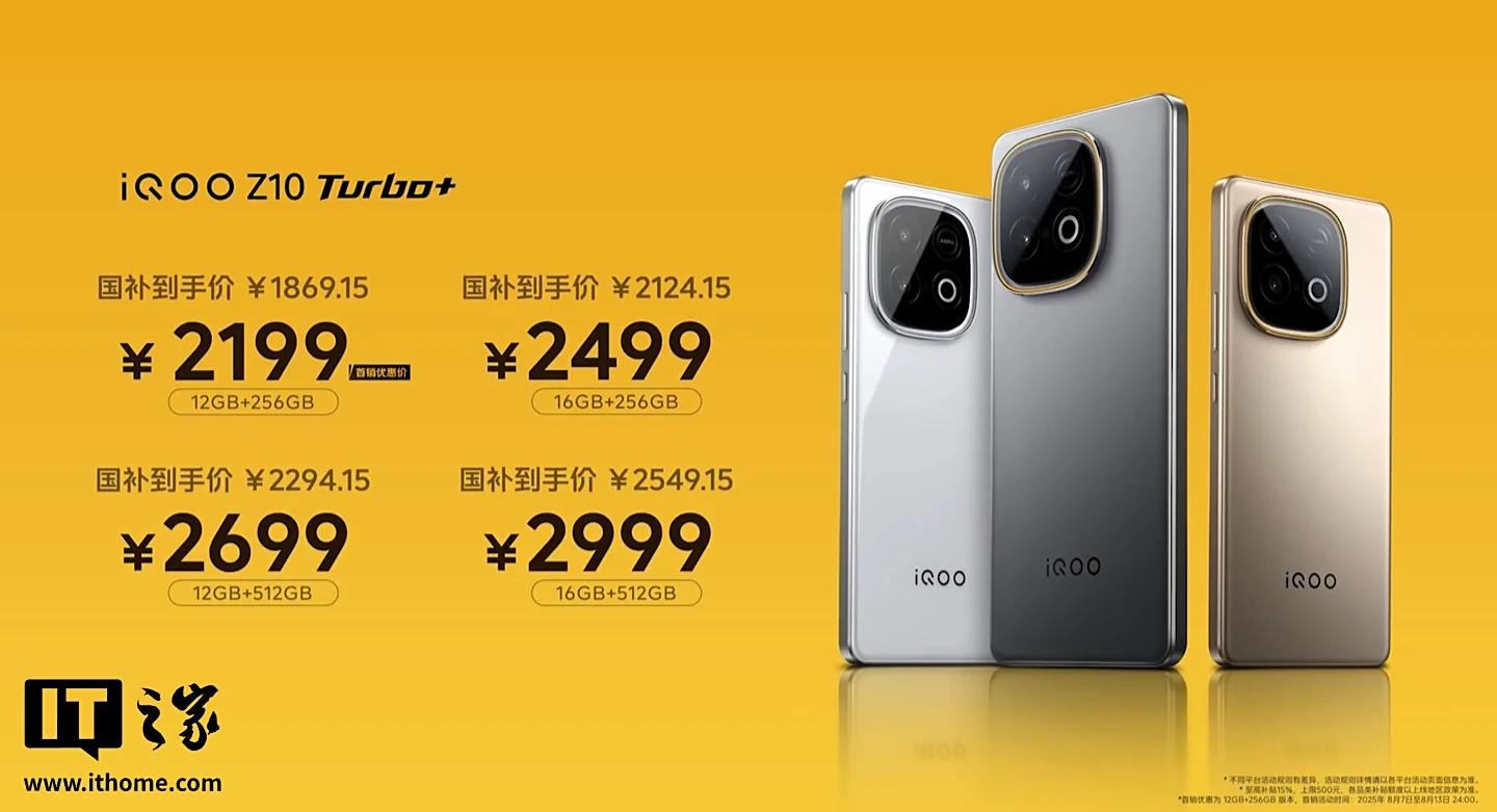 IT之家 8 月 7 日消息,iQOO Z10 Turbo+ 手机已正式发布,新机搭载 8000mAh 电池、天玑 9400+ 处理器,售价 2199 元起,叠加国补售价 1869.15 元起。