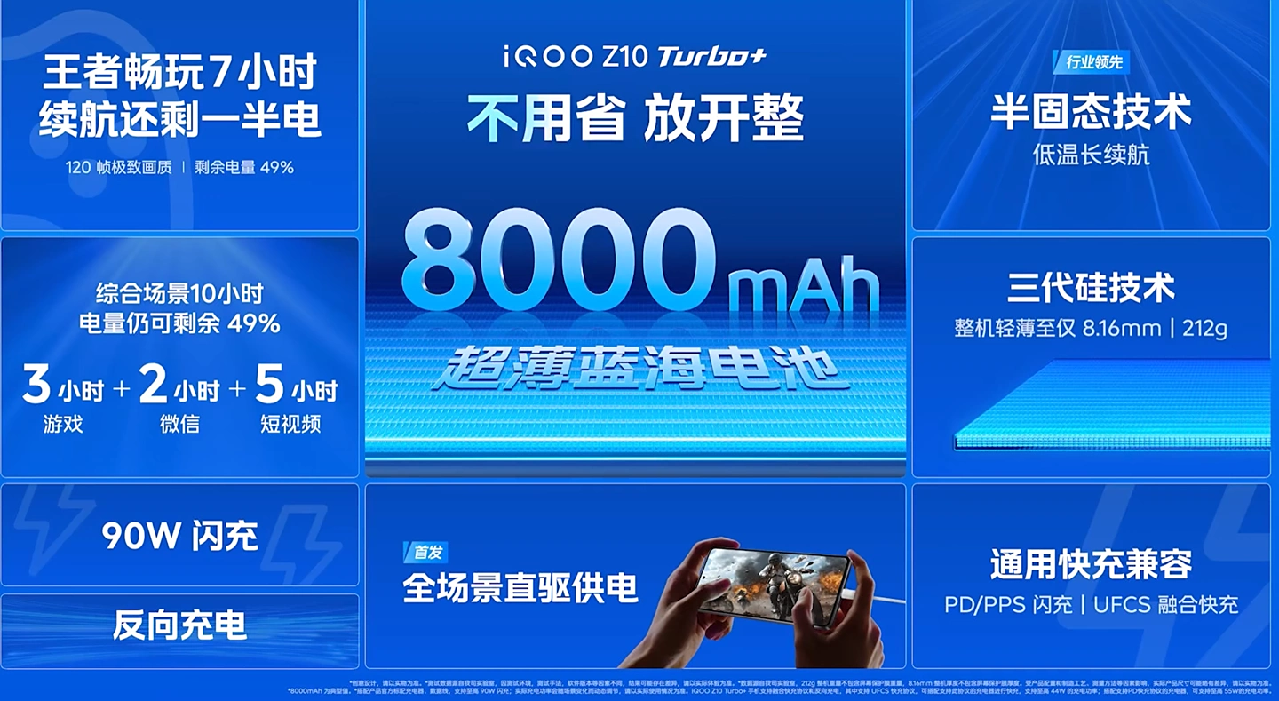 iQOO Z10 Turbo+ 搭载 8000mAh 超薄蓝海电池,是蓝厂史上最大电池容量。真实使用场景下,游戏 + 微信 + 短视频 10 小时畅玩,仍剩余 49% 的电量。机身重量为 212g、厚度为 8.16mm,支持 90W 闪充、反向充电、直驱供电技术,支持 55W PD、44W 第三方 UFCS。