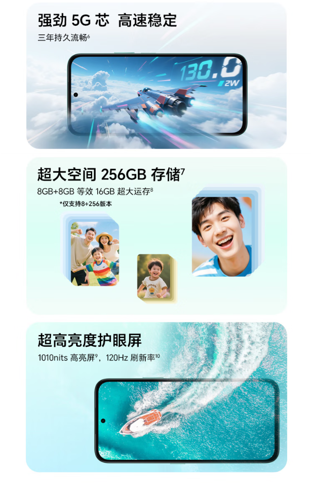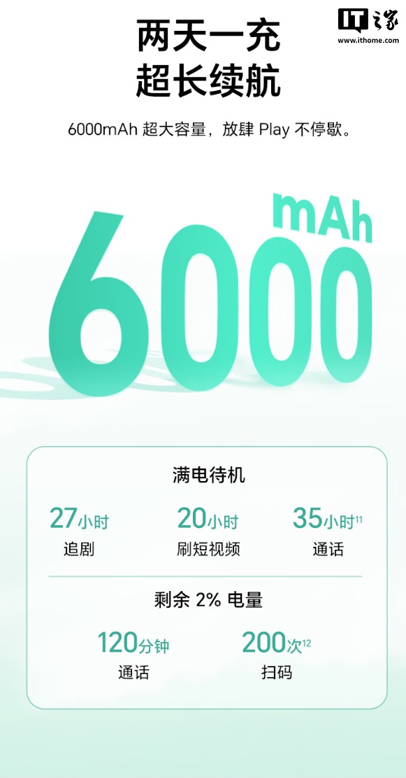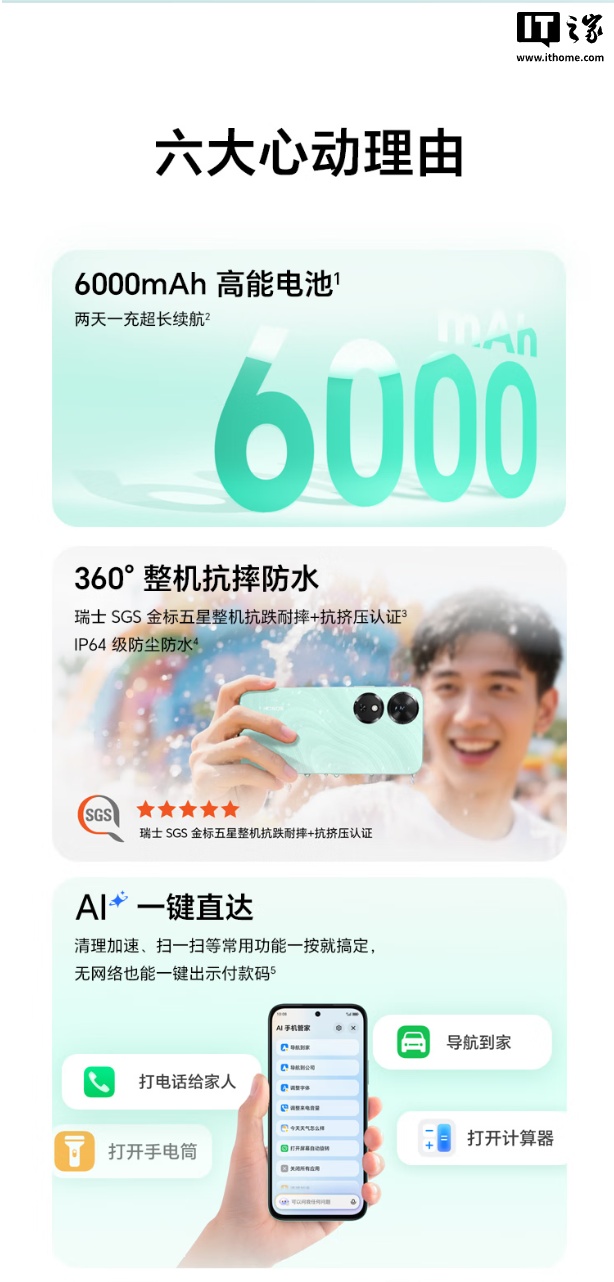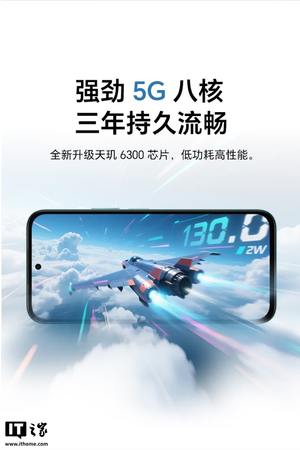 硬件方面,这款手机搭载联发科天玑 6300 处理器,支持 5G 通信,号称“三年持久流畅”,内置 6000mAh 电池,可连续通话 35 小时、刷 20 小时短视频;配有 6.61 英寸屏幕,支持 120Hz 高刷,最高亮度可达 1010 尼特。