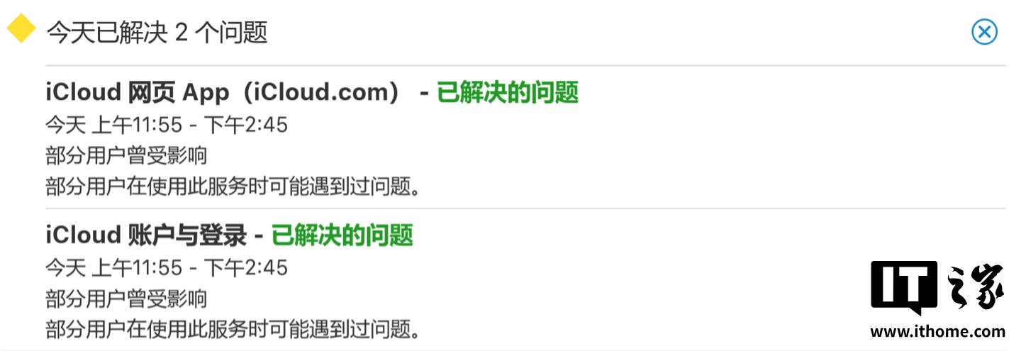IT之家查询苹果服务器状态页面,官网显示自今天上午 11 点 55 分到下午 2 点 45 分,部分用户反馈 iCloud 网页 App(iCloud.com)出现故障,目前已经解决修复。