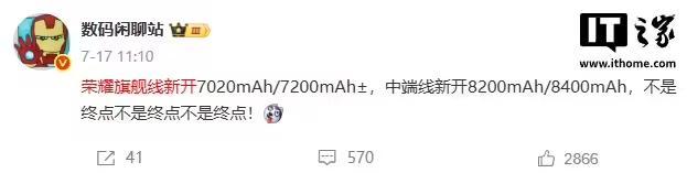 值得一提的是,该博主此前曾透露荣耀旗舰线(此处预计指旗舰手机)新开 7020mAh / 7200mAh± 电池,中端线(预计指中端机型)新开 8200mAh / 8400mAh 电池,并且他强调“不是终点”。