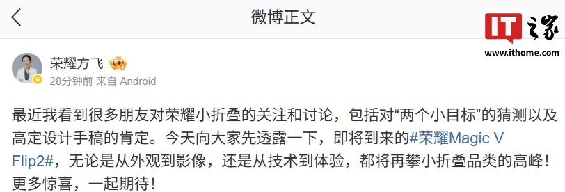 IT之家 8 月 11 日消息,荣耀终端股份有限公司产品线总裁方飞今日发文称,看到了很多朋友对荣耀小折叠的关注和讨论,包括对“两个小目标”的猜测以及高定设计手稿的肯定。她透露,即将到来的 Magic V Flip2 手机无论是从外观到影像,还是从技术到体验,都将再攀小折叠品类高峰。