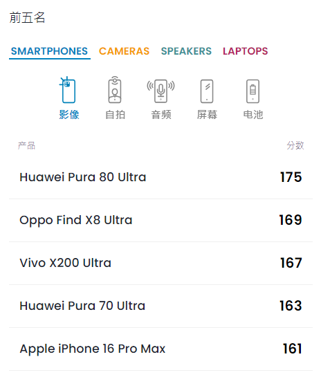 IT之家查询 DXOMARK 官网获悉,华为 Pura80 Ultra 成为了唯一一款 DXOMARK 影像得分 170 以上的手机,前五排名如下: