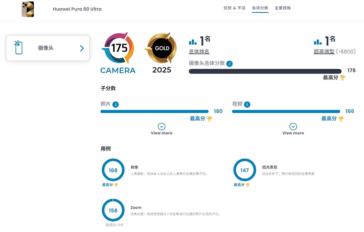 华为 Pura80 Ultra 的视频子项获得 166 分,与 iPhone 16 Pro Max 和 OPPO Find X8 Ultra 并列第一:多光照环境下细节保留与降噪表现出色,防抖稳定流畅,即便手持拍摄也能获得丝滑画面,高倍视频变焦依旧清晰,为创作提供更大空间。