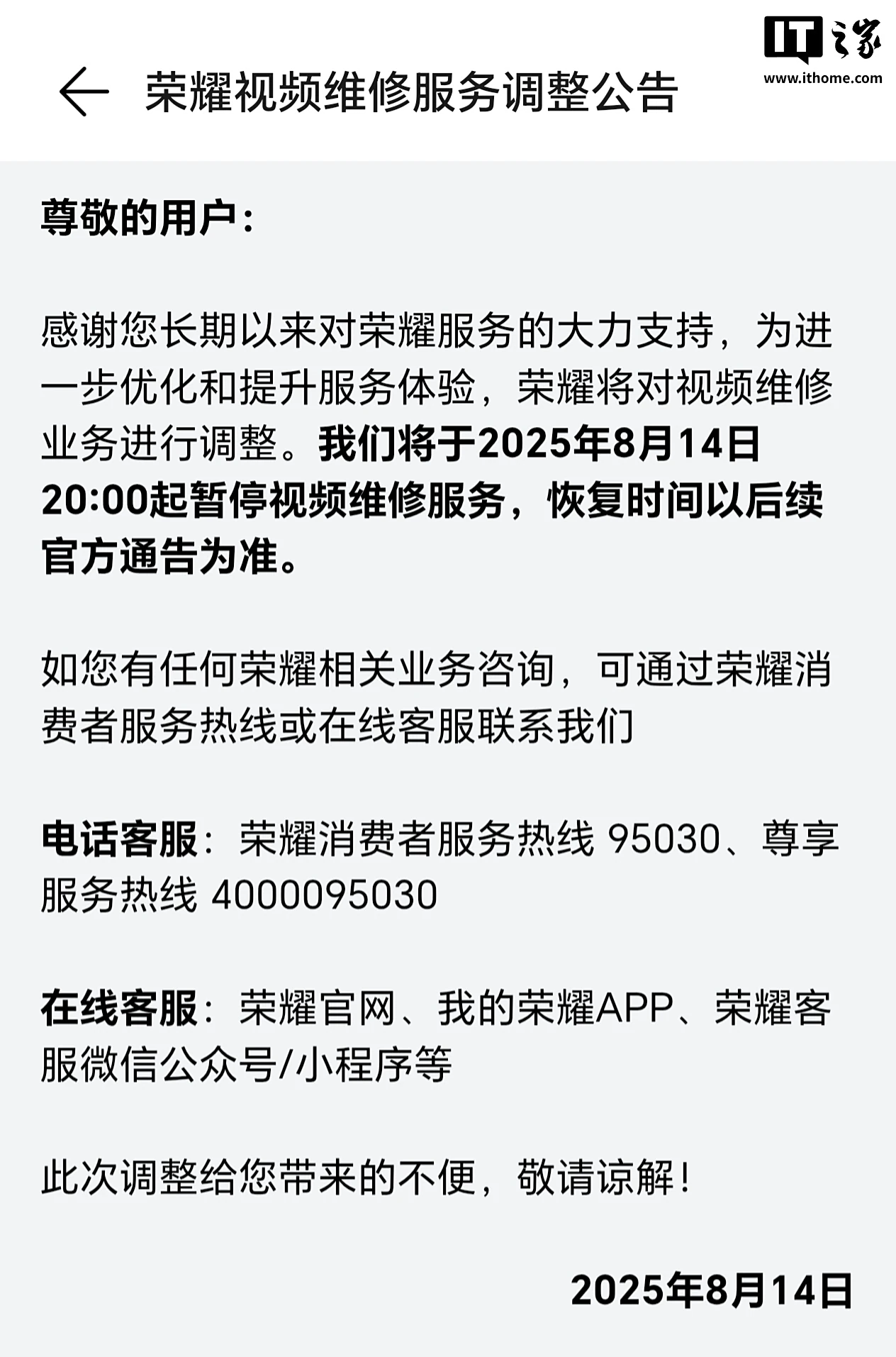 IT之家 8 月 14 日消息,荣耀发布《荣耀视频维修服务调整公告》,将于 2025 年 8 月 14 日 20:00 起暂停视频维修服务,恢复时间以后续官方通告为准。