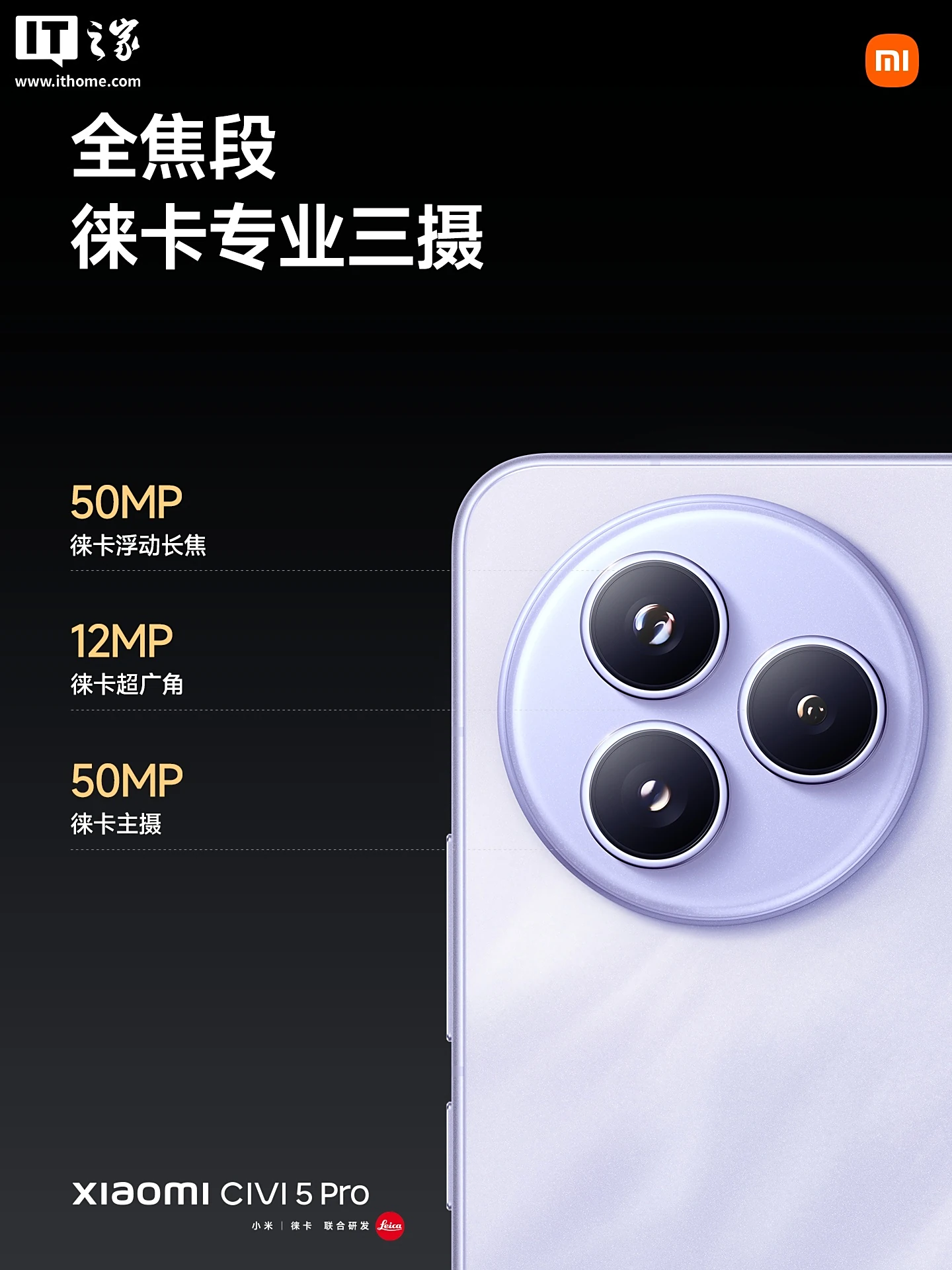 小米 Civi 5 Pro 使用“大圆”风格镜头相机,后置 50Mp 大底徕卡三摄(F1.63-F2.2 光圈),拥有 60mm F2.0“大光圈直立长焦微距”镜头。