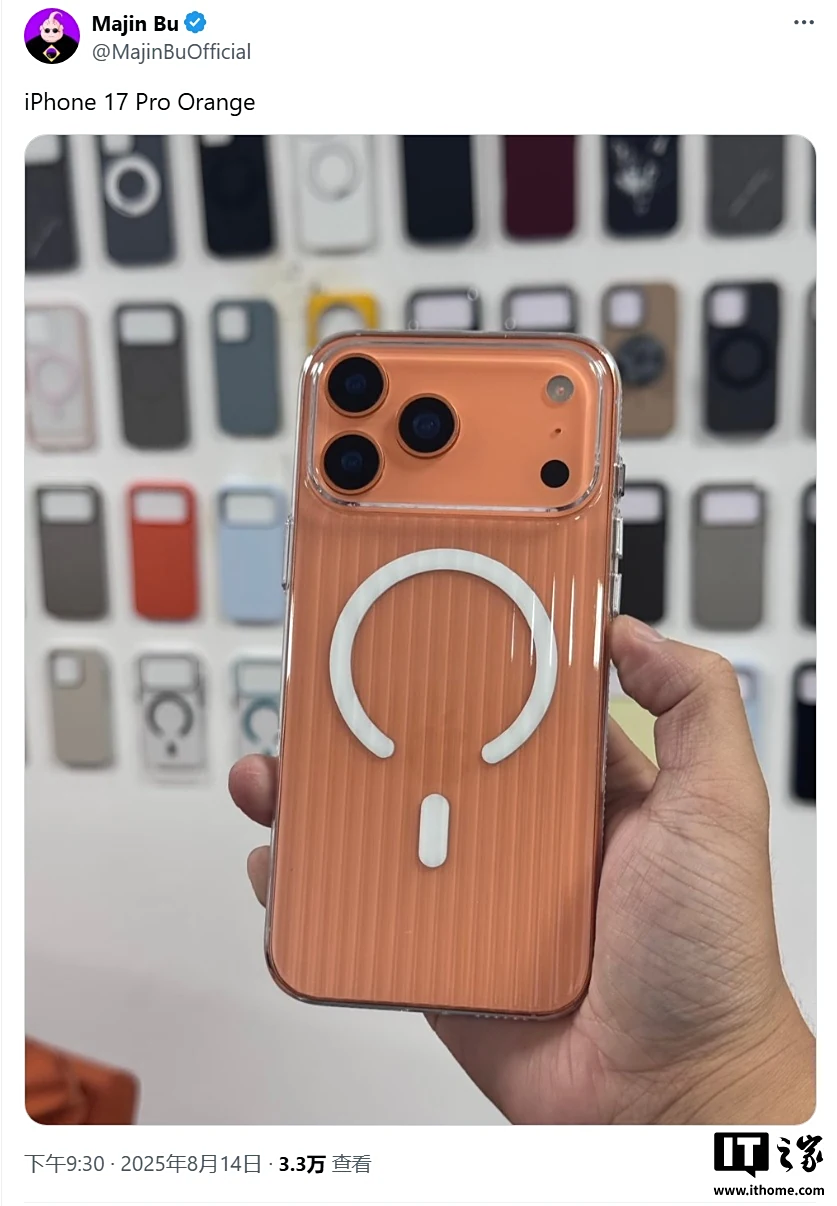 Majin Bu 昨日还在 X 平台发布推文,分享了一张图片,展示了橙色版 iPhone 17 Pro 机模:
