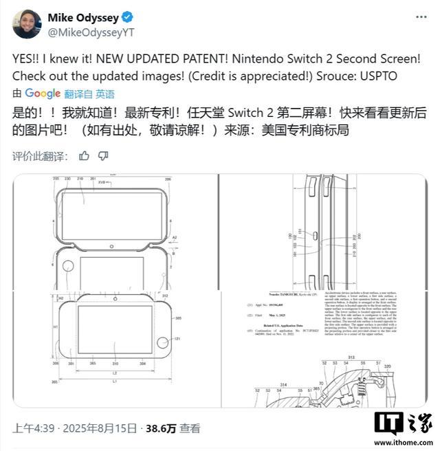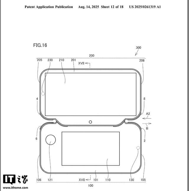 IT之家 8 月 16 日消息,消息源 @MikeOdysseyYT 昨日(8 月 15 日)在 X 平台发布推文,曝料称美国商标和专利局(USPTO)公示了任天堂申请的新专利,展示了双屏设计的 Switch 游戏掌机。