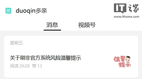 IT之家 8 月 18 日消息,防沉迷手机厂商多亲 8 月 15 日发布《关于刷非官方系统风险温馨提示》,IT之家附全文如下: