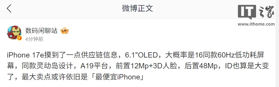文章来源于互联网:IT之家-最便宜 iPhone:苹果 iPhone 17e 手机被曝搭载 A19 平台,16 同款“灵动岛”+ 60Hz 屏