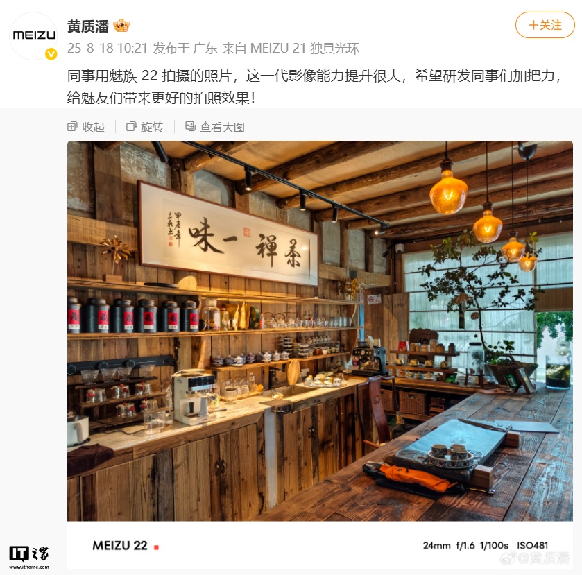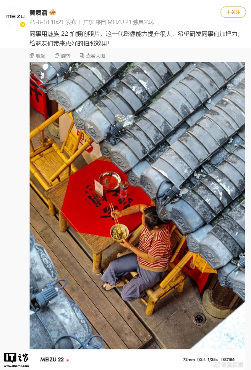IT之家 8 月 18 日消息,星纪魅族集团 CEO 黄质潘今天在微博曝光了旗下魅族 22 手机的拍摄样张。
