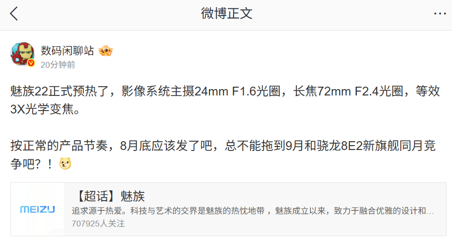 文章来源于互联网:IT之家-魅族 22 手机后摄阵容曝光:主摄 24mm f/1.6、长焦 72mm f/2.4,等效 3 倍光学变焦