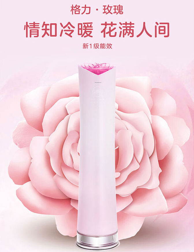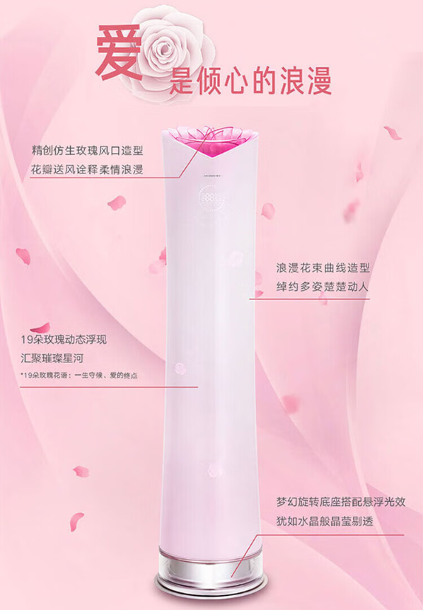 目前这款格力玫瑰空调仍然可以在线上购买,售价近3万元,造型像是一颗含苞待放的玫瑰,风口采用了仿生玫瑰的造型,空调腰身采用了类似花束的曲线设计,并且会动态浮现19朵玫瑰,而19朵玫瑰花语则代表了一生守候、爱的重点。