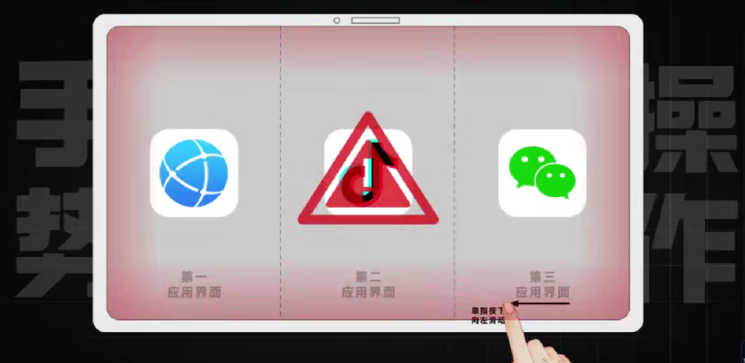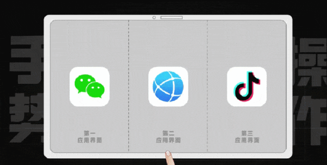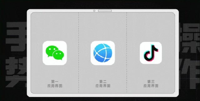 华为这专利的方法是:在任何一个应用界面上做个手势完成切换比如屏幕上并排显示着三个应用。