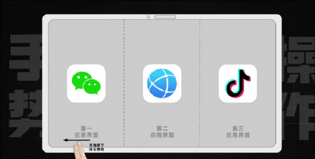 比如左边微信、中间浏览器、右边抖音,在微信界面底部按着向右一滑。