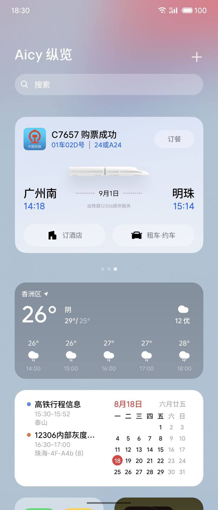 陈家沂还分享了 12306 实况通知的实装效果。从图片可以看到,该功能的使用场景覆盖负一屏“Aicy 纵览”、实况通知、锁屏提醒等。