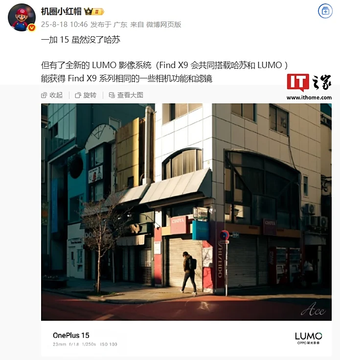 IT之家 8 月 18 日消息,一张水印标注机型为“OnePlus 15”的照片已在互联网平台曝光,其中缺失了哈苏联名 LOGO。博主 @机圈小红帽 透露,一加 15 虽然没了哈苏,但有了全新的 LUMO 影像系统(Find X9 会共同搭载哈苏和 LUMO),能获得 Find X9 系列相同的一些相机功能和滤镜。