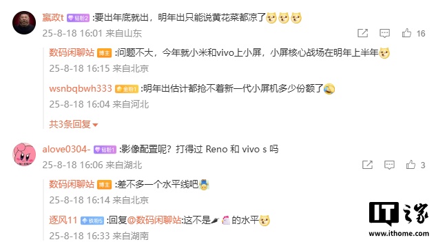 该博主还在评论区透露,今年就小米和 vivo 上小屏,小屏核心战场在明年上半年。影像方面,该机据称与 OPPO Reno 系列、vivo S 系列“差不多一个水平线”。