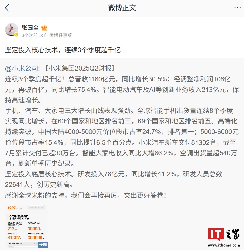 IT之家 8 月 19 日消息,小米集团今日发布了截至 2025 年 6 月 30 日的 2025 年第二季度财报,小米手机系统软件部总监张国全转发了该消息,并表示“坚定投入核心技术,连续 3 个季度超千亿”。