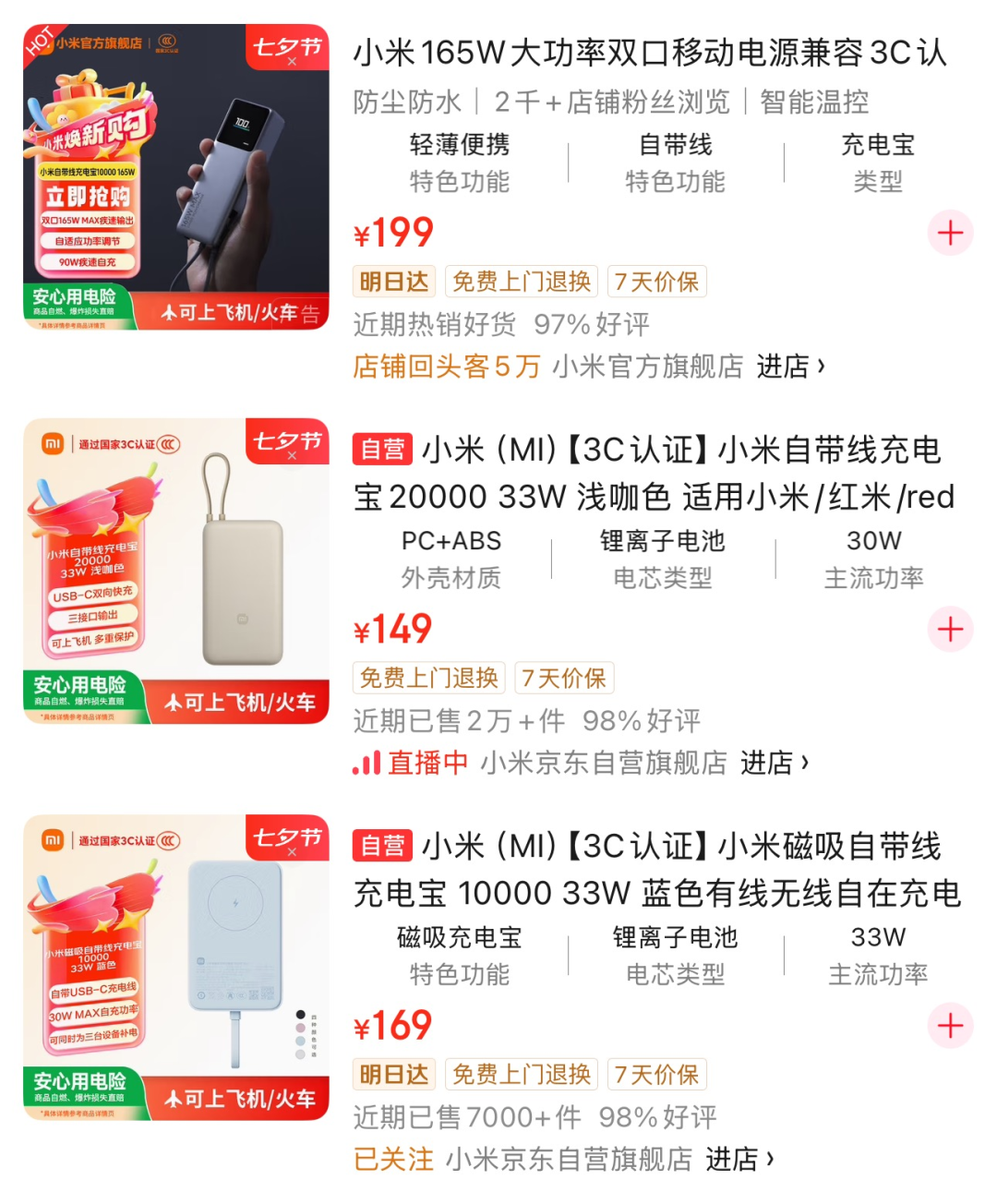 在罗马仕、安克产品全网下架的同时,小米充电宝搜索量暴涨300%,市场上一度传出“罗马仕跌倒,小米吃饱”的声音。据媒体报道,2025京东618的战报中,小米旗下的酷态科在充电宝品类成交额排名第一,而小米主品牌的33W充电宝位列“最受欢迎单品”榜首。