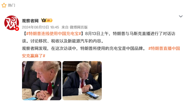 #特朗普连线使用中国充电宝#等相关话题,在微博累计取得超800万阅读。