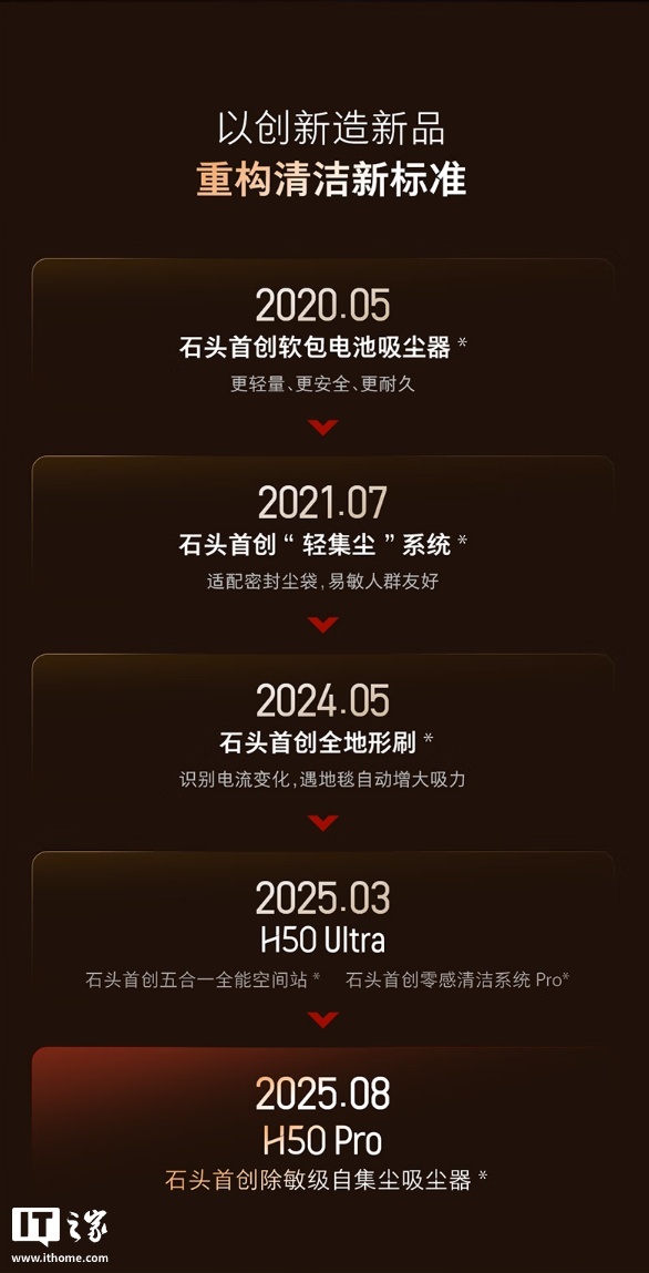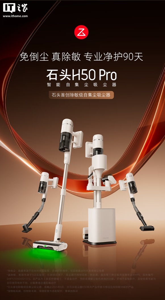 IT之家 8 月 20 日消息,石头 H50 Pro 无线自集尘吸尘器现已上市,主打双驱新风自集尘系统,通过了 SGS 吸力无损认证,预购价 1999 元。