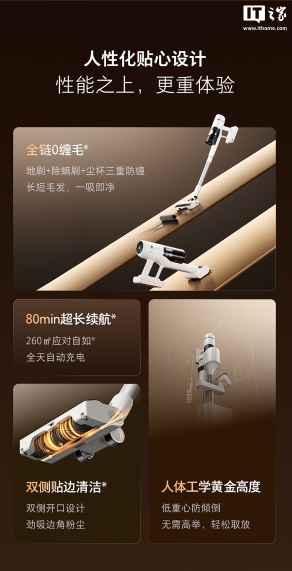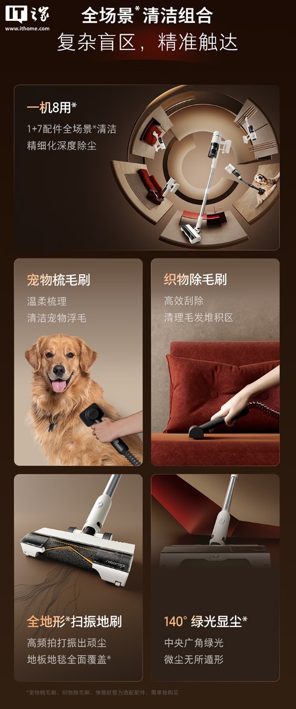 IT之家注意到,这款吸尘器还带有全链 0 缠毛设计,地刷、除螨刷、尘杯三重防缠,自带 1+7 配件,其中的宠物梳毛刷可为宠物清理浮毛,全地形扫振地刷可清理地板、地毯等。