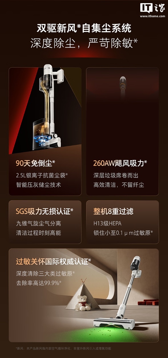 据介绍,这款吸尘器具有 260AW 飓风吸力,可清扫家中深层次的垃圾,内置九锥气旋尘气分离系统,通过了 SGS 吸力无损认证,整机配备 8 重过滤,配有 H13 级 HEPA 滤网,号称“可锁住小至 0.1μ m 过敏原”。