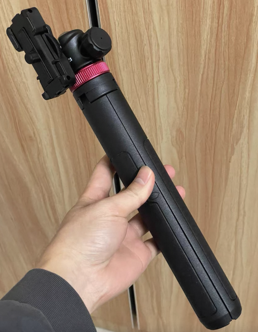 用的时候,拉开支架,拔出杆子就能架好机位了,用不着三脚架的时候,直接拿在手里,还能用来自拍🤳