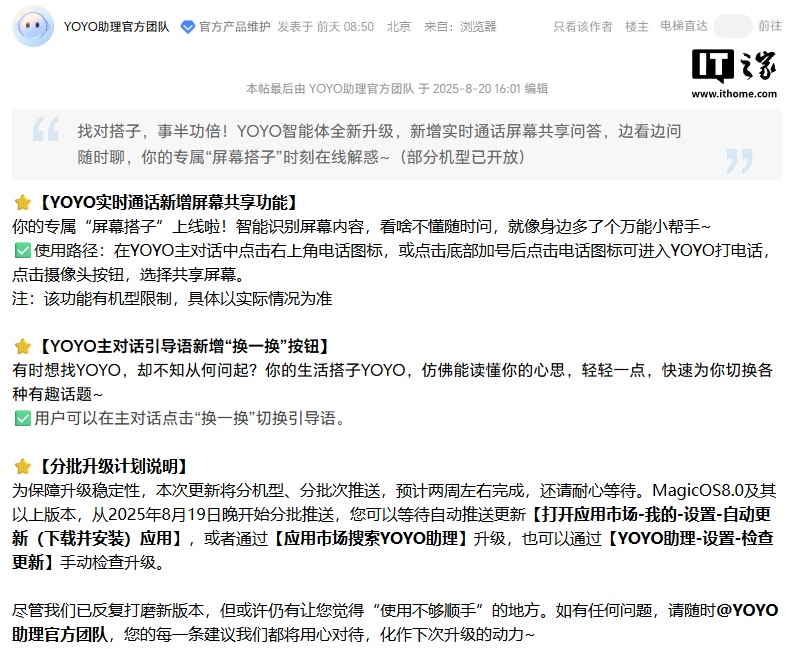 文章来源于互联网:IT之家-荣耀 YOYO 智能体升级实时通话新增屏幕共享等功能,Magic 4 / 5 等旧机型适配可用