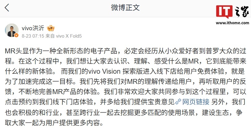 洪沂还表示,MR 头显作为一种全新形态的电子产品,必定会经历从小众爱好者到普罗大众的过程。vivo Vision 探索版进入线下店给用户免费体验,就是为了加速完成这一目标。