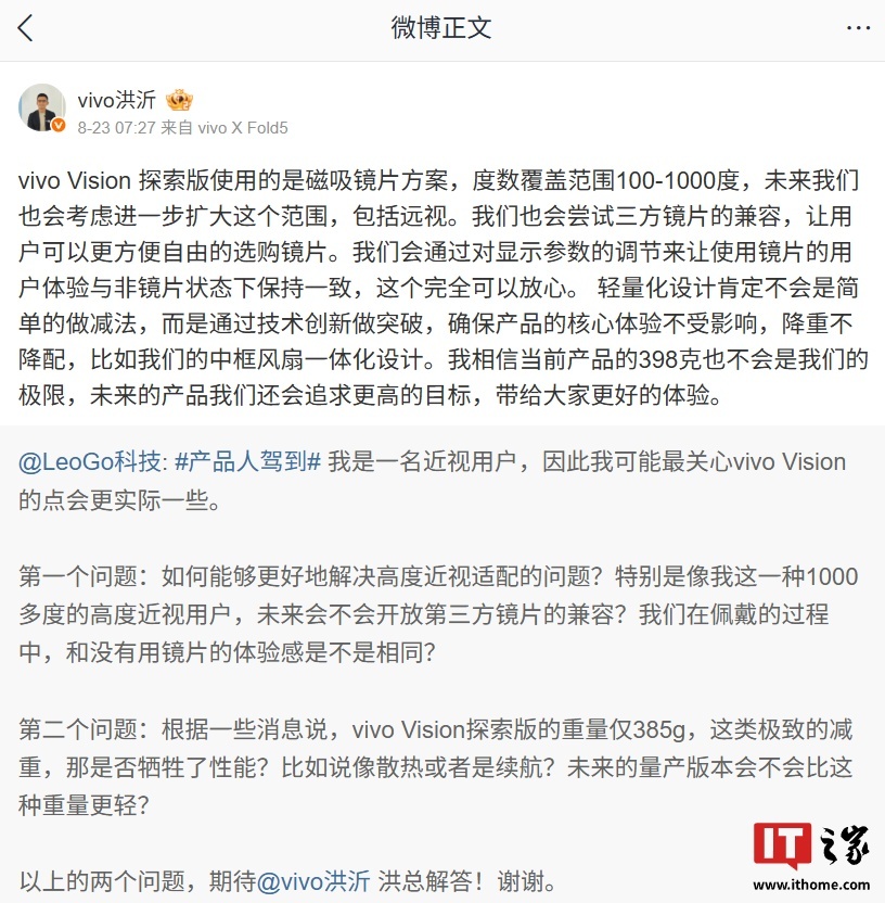 vivo 智慧终端产品总经理洪沂昨日在微博解答了关于这款头显的近视适配和减重是否减配相关问题,其中提到:vivo Vision 探索版使用磁吸镜片方案,度数覆盖范围 100-1000 度,会尝试三方镜片的兼容。另外他表示,轻量化设计不会是简单的做减法,而是通过技术创新做突破,确保产品的核心体验不受影响。