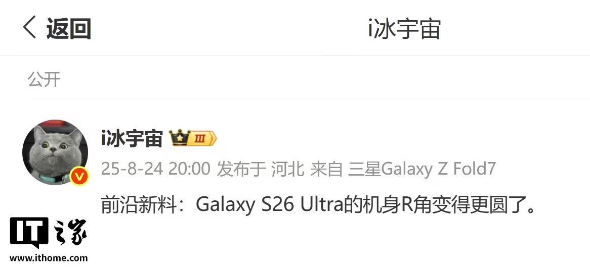 IT之家 8 月 25 日消息,消息源 @i冰宇宙 昨日(8 月 24 日)发布微博,曝料称三星 Galaxy S26 Ultra 手机的机身 R 角变得更圆了。
