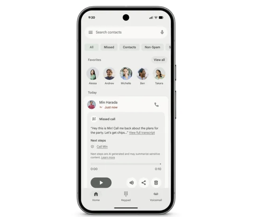 在通话方面,AI的“留言”功能可以提供未接或拒接来电的实时文字转录,AI还会根据收到的信息自动识别下一步行动。