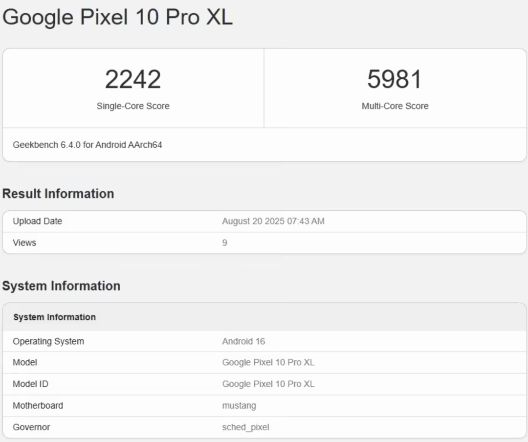 当然,从绝对性能来看,根据Geekbench官网数据,Tensor G5在Geekbench 6测试中CPU单核跑分约为2240分,多核跑分约为6000分,相比高通旗舰骁龙8 Elite的单核2850分、多核9400分,差距仍然比较明显。