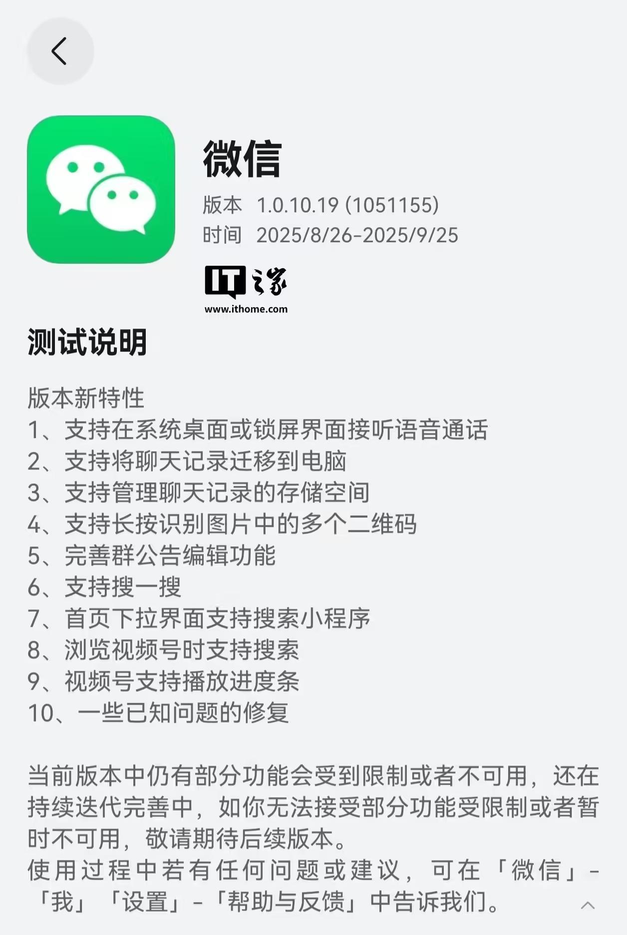 IT之家 8 月 27 日消息,微信鸿蒙版 App 昨日晚在华为应用市场(App Gallery)开启 1.0.10.19 (1051155)版本邀测升级(需收到短信通知后点击链接跳转安装,未收到短信需继续等待),测试时间为 2025/8/25-2025/9/24。