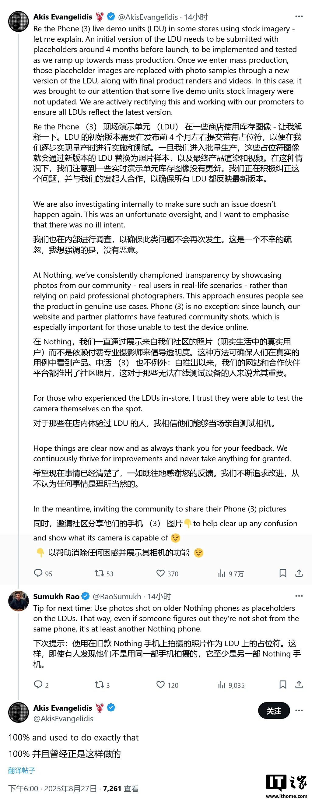 面对批评,Nothing 联合创始人 Akis Evangelidis 在社交平台 X 上道歉,称这是一次“不幸的疏忽”。他解释,演示软件在四个月前需提交初版,占位图原计划在量产后更换为真实样张,但部分设备未更新。他表示公司正在内部调查,确保类似问题不再发生。
