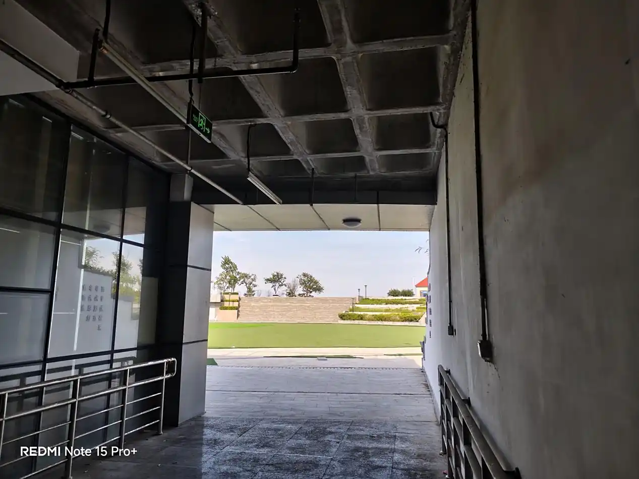 接下来是光线对比强烈的场景,从地库出口往外拍,可以看到,照片上地库内光线昏暗的地方依然保持了足够的亮度,内部建筑的细节都能看清,同时室外高光部分也没有明显过曝(稍微有一点点过曝的倾向),可见 REDMI Note 15 Pro + 在面对这种光线环境对比强烈的场景也能呈现出令人满意的动态范围能力。