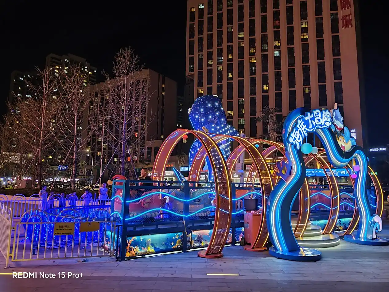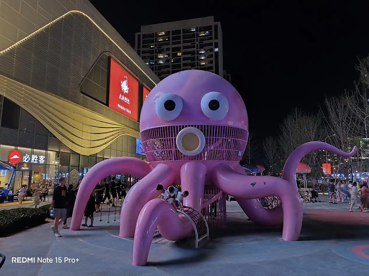 接着我们来看一下夜晚场景,REDMI Note 15 Pro+ 主摄的“光影猎人 800”传感器确实能为其带来不错的夜间拍照效果,比如下面这张照片,场景是比较黑暗的,并且光线环境也比较复杂,而 Note 15 Pro + 直出的照片画面明亮干净,暗部基本没有明显的噪点,色彩准确明艳,提高了观感,同时在复杂光线下白平衡表现也不错,章鱼眼的白色很好地还原了当时实际的色泽。