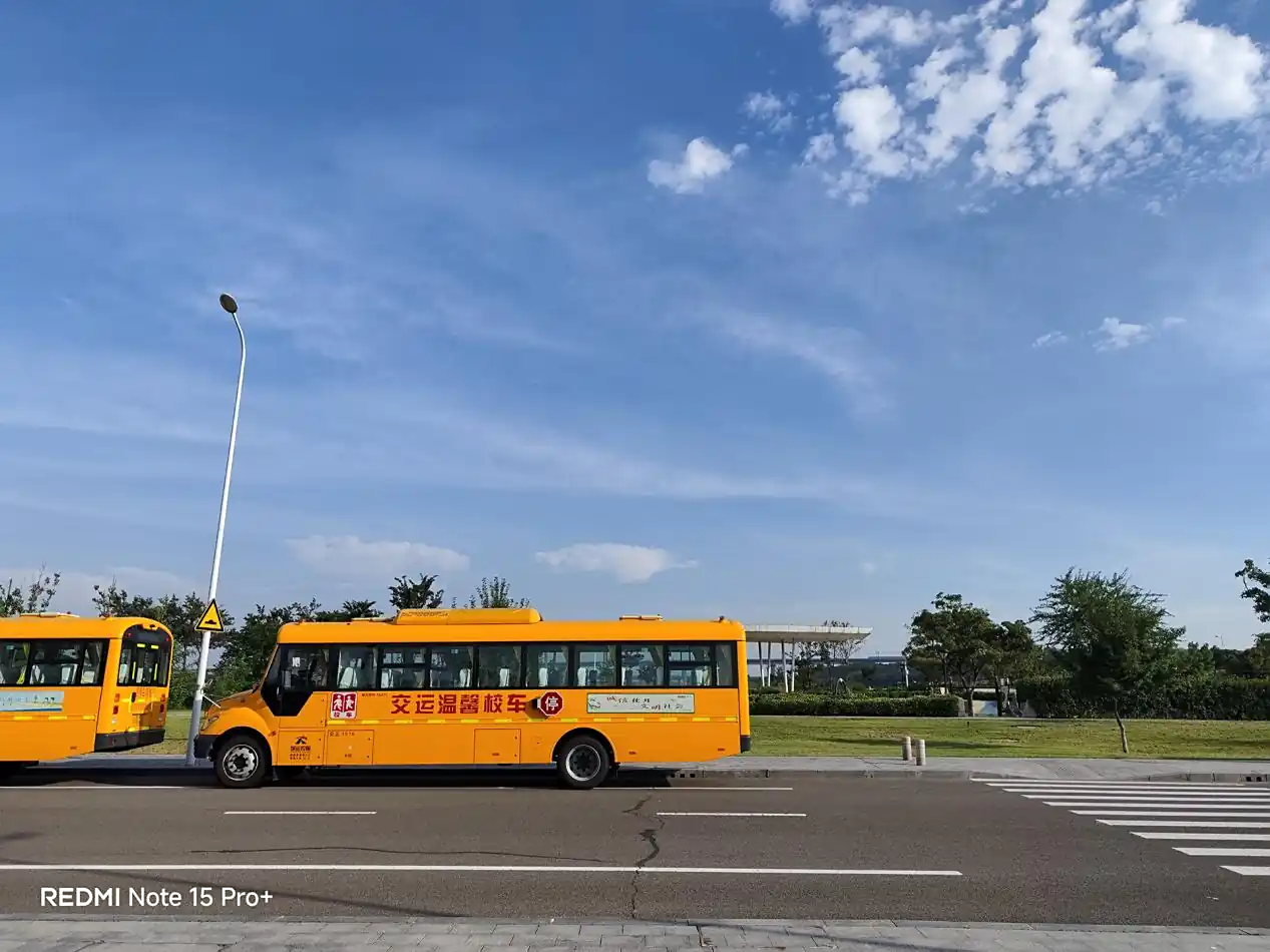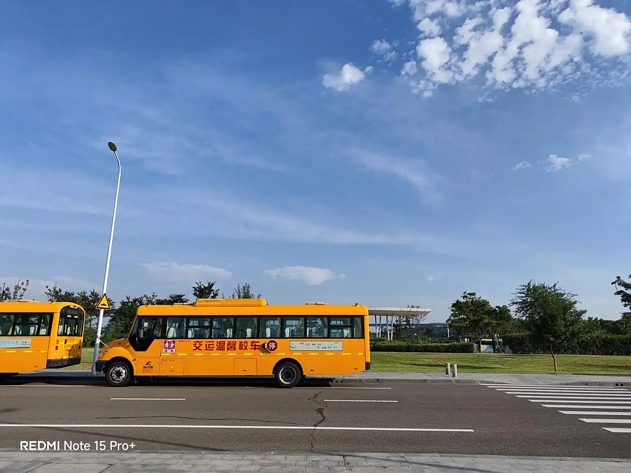 REDMI Note 15 Pro + 还支持超清全像素模式,使用超清模式再拍一张,超清模式下画面的色彩要稍微略淡一些。放大后看细节,校车上的文字轮廓明显更清晰,同时小字整体上也更清晰了,依稀可以辨认。