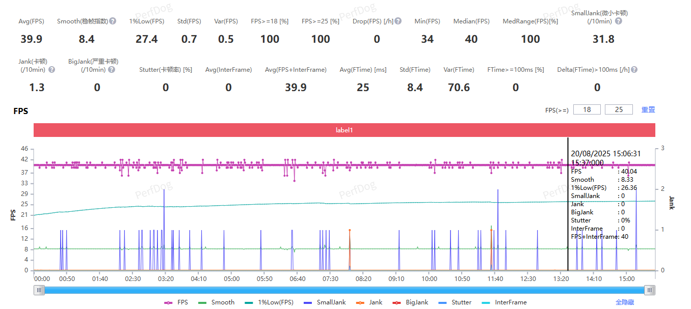测试结束时,可以看到 Note 15 Pro + 运行《和平精英》平均帧率为 39.9 FPS,帧率曲线同样也是很平稳的,游玩的时候没有卡顿或掉帧的感觉。