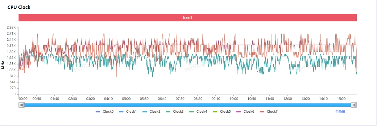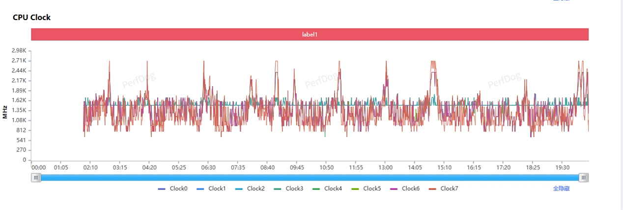 从 CPU 核心调度情况来看,第四代骁龙 7s 的 8 个核心基本都参与了性能输出,其中 Cortex-A720 超大核间断性会冲高到 2.7GHz 满频率然后快速回落,整体来说,8 个核心大部分时间基本在 0.8GHz 到 1.8GHz 之间波动,以保证游戏的流畅运行。