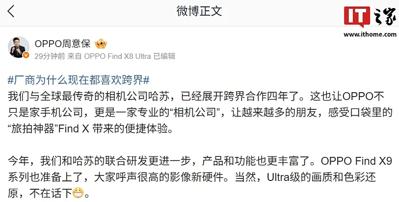 IT之家 8 月 27 日消息,OPPO Find X9 系列手机发布时间逐渐临近,目前官方已开启新机的前瞻预热。OPPO Find 系列产品负责人周意保今日发文解释了厂商为什么现在都喜欢跨界合作这一问题: